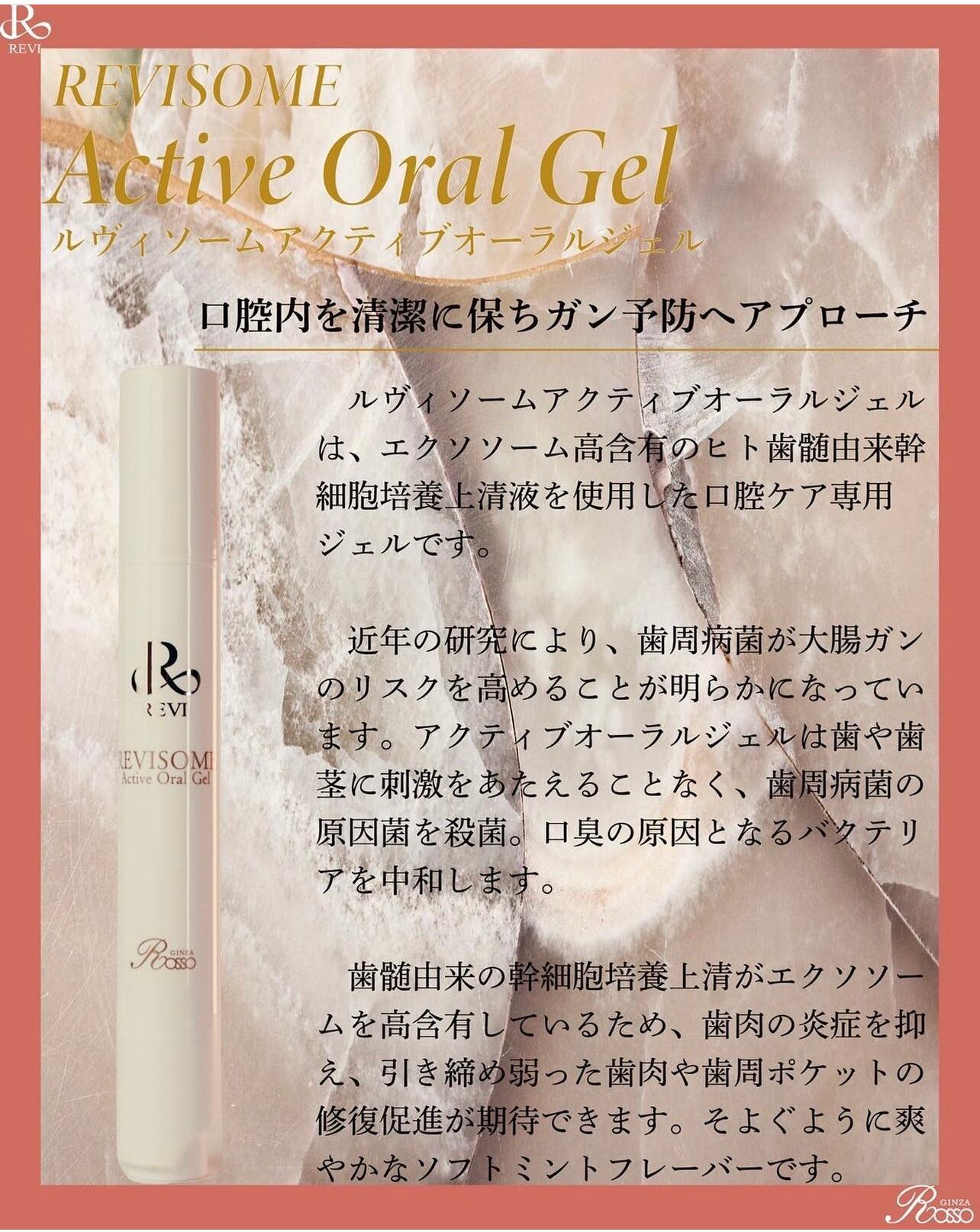 口腔内を清潔に保つための、エクソソーム高含有の歯髄由来幹細胞培養上清液を使用した口腔ケア専用ジェルです。 近年の研究により、歯周病菌が大腸がんのリスクを高めることが明らかになり、口腔ケアも非常に注目されています。 歯肉の炎症を抑え、引き締め、弱った歯肉や歯周ポケットの修復促進が期待できます。