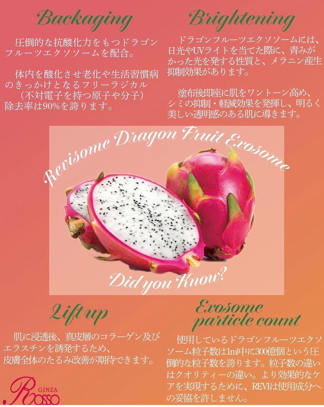 そのフリーラジカル除去率は90%を誇ります。ドラゴンフルーツエクソソームは肌に浸透後、真皮層のコラーゲンおよびエラスチンを誘発するため、皮膚全体のたるみの改善が期待できます。また、メラニン抑制の働きも活発で肌のブライトニングやシミの抑制も期待できます。
