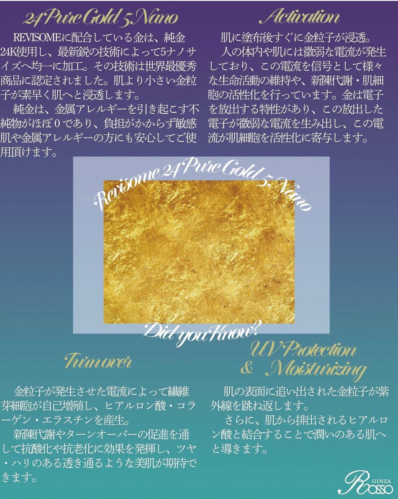 化粧品原料として使用されるのは珍しい純金 (24K) を、最新鋭のテクノロジーによって5ナノサイズへ均一に加工しました。肌よりも小さい金粒子は塗布後に素早く肌へと浸透し、肌力をアップ。ツヤとハリを生み出し、透明感のある美顔、美肌を作り上げます。純金は金属アレルギーを起こしにくく、安心してご使用いただくことが可能です。