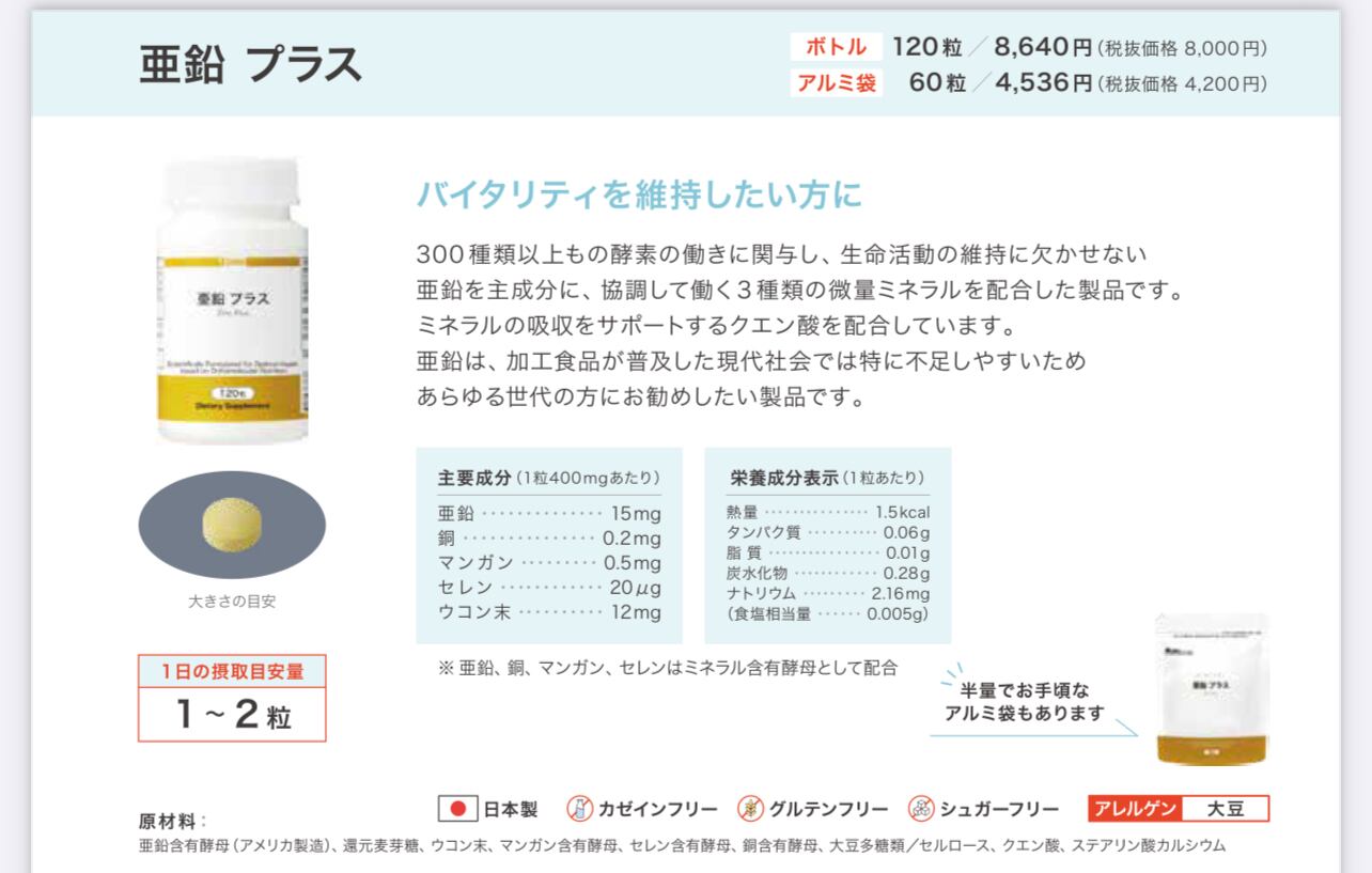 亜鉛を主成分に、協調して働く3種類の微量ミネラルを配合した製品です。